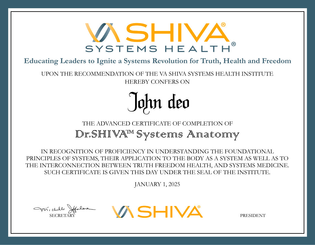 The Dr.SHIVA™ – Systems Anatomy Certificate is awarded to students who successfully complete the curriculum allotted in the course. The certificate validates the efforts and commitment to studying and learning the principles of systems science to properly learn and teach the knowledge and technology of Systems Health® and its principles.