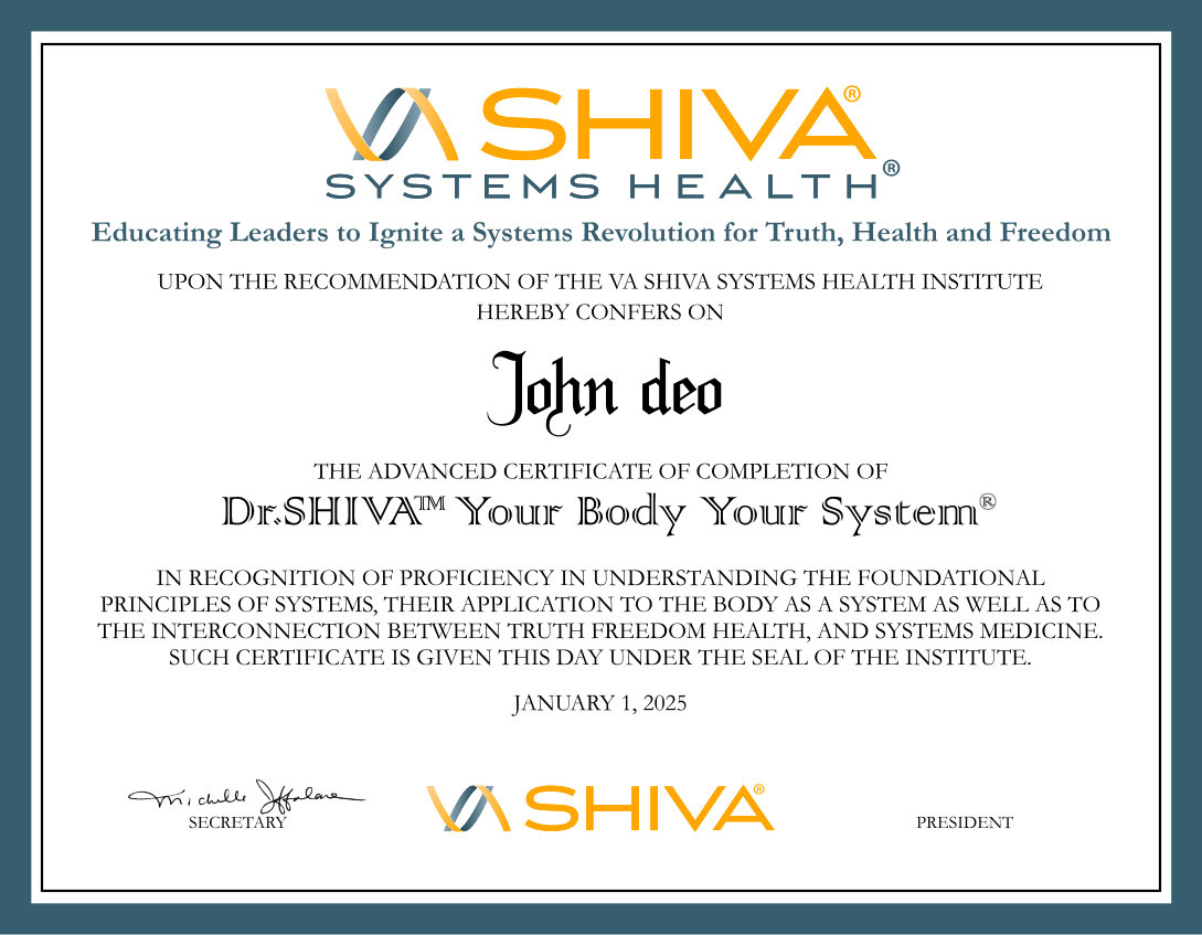 The Dr.SHIVA™ – Your Body, Your System® Certificate is awarded to students who successfully complete the curriculum allotted in the course. The certificate validates the efforts and commitment to studying and learning the principles of systems science to properly learn and teach the knowledge and technology of Systems Health® and its principles.