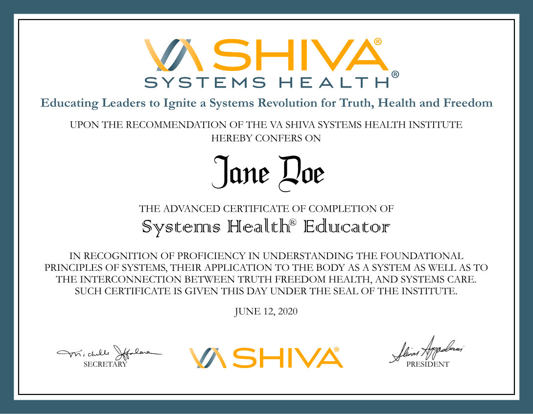 The Systems Health® Educator – Master Certification is awarded to students who successfully complete the lectures and laboratory work allotted in the program. The certification validates the efforts and commitment to studying and learning the principles of systems science and properly teaching the knowledge and technology of Systems Health® and its principles.